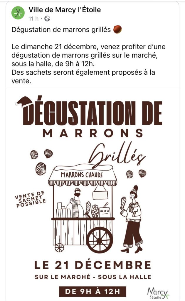 L’animation « Marrons Chauds » évoque l’esprit réconfortant de l’automne à travers l’expérience des châtaignes grillées sur les marchés en plein air. Elle célèbre la convivialité et la chaleur des rassemblements conviviaux, cette animation unit les gens et préserve les traditions. Jusqu’au début de l’Hiver, elle nous invite à apprécier les plaisirs simples en partageant ce délice avec nos proches.