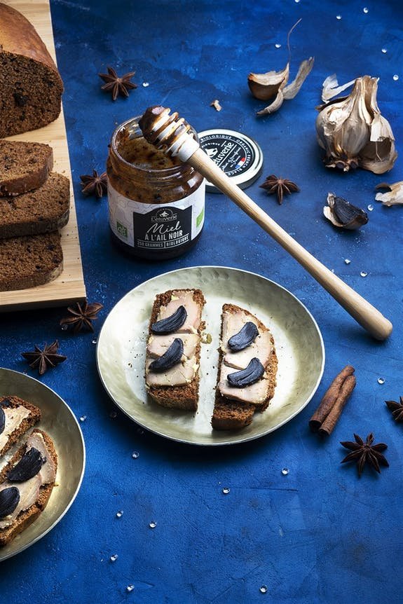 Un mélange subtil de miel bio français et d’ail noir bio gersois pour allier les bienfaits et les qualités nutritionnelles de deux supers aliments. Le miel à l’ail noir est idéal pour vos préparations aussi bien salées que sucrées. Le goût sucré et délicat de l’ail noir et la douceur du miel en font un ingrédient idéal pour de nombreux plats, marinades, vinaigrettes ou simplement en toast. Parfait pour laquer vos viandes et poissons, accompagner vos fromages, vos salades, il sera également délicieux dans de nombreux desserts : crêpes, cakes, madeleines, pain d’épice